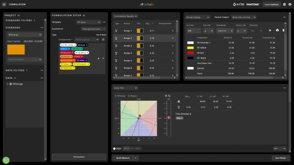 3)選擇需使用的油墨和基材,并確定是否納入剩余油墨 4)利用此信息計算多種配色方案,并可按最低成本或其他性能指標(如色差ΔE、組分數量、光譜偏差等)排序