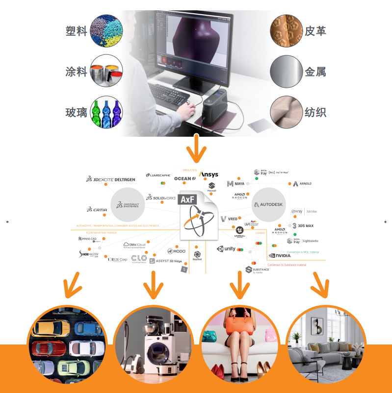 AxF通過精確捕捉材料的顏色、光澤度和紋理等外觀屬性,實現了材料外觀從現實的物理世界到虛擬的數字空間的精準映射與高效協同,從而顯著減少對實體樣品的依賴并加速產品上市周期。